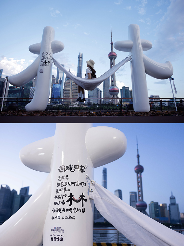 这座诗歌乐园,将孩子们的快乐具象化:在蓝调的天空下,晃荡着独属于汉字的诗意;「大」字的长横上,排排坐满了小朋友,一起玩集体跷跷板;躺进「林」字的吊床上发呆,读读小朋友的诗,时间就慢下来了,「人」字是滑滑梯……“风、伞、大、林、人”这些字,也是孩子们诗里描绘最多的意象。